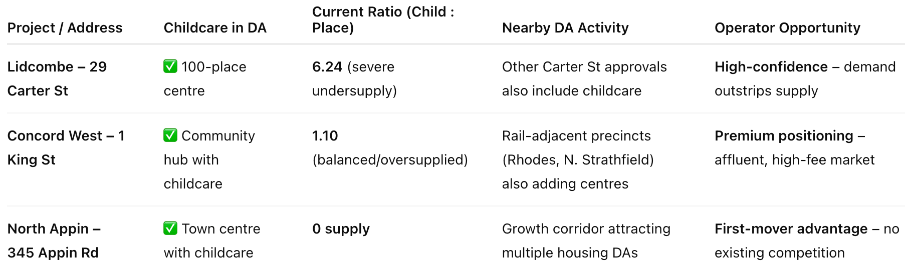 Below we examine three significant projectsโLidcombe, Concord West, and North Appinโwith childcare market metrics, DA inclusions, and implications from a developer/operator perspective.