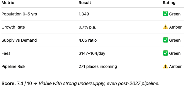 Supply/Demand Balance: ⚠️ Tight — one centre absorbs any pent up demand and projected demand uplift.