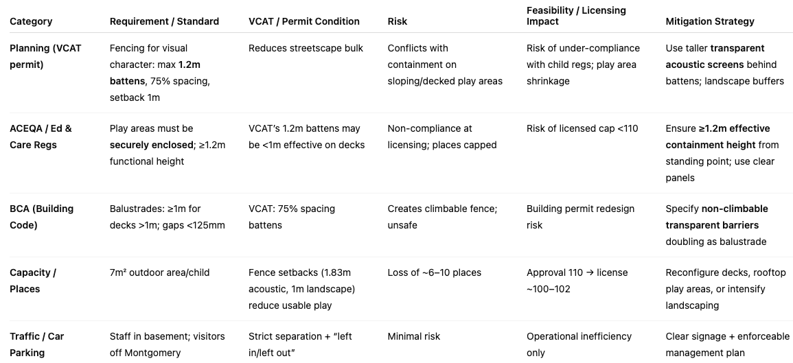 Net result: VCAT’s visual amenity fix collides with child safety and licensing regs. Corner dominance and an overbearing presence was an issue here. Unless carefully resolved, usable outdoor play space shrinks, and capacity could dip ~8–10 places.