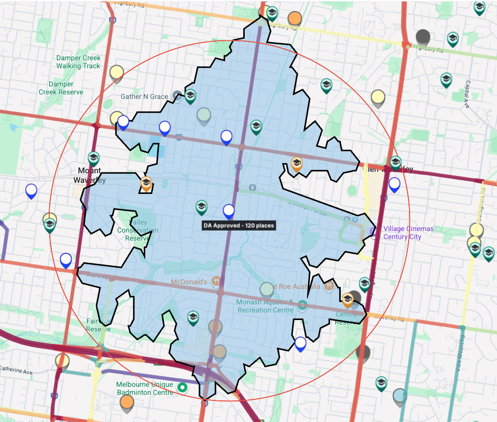 📊 Catchments tell two stories: A 2km radius looked green, but drive-time and traffic filters showed the real pool. Blackburn Rd is a southbound commuter play, not a full-circle catchment.