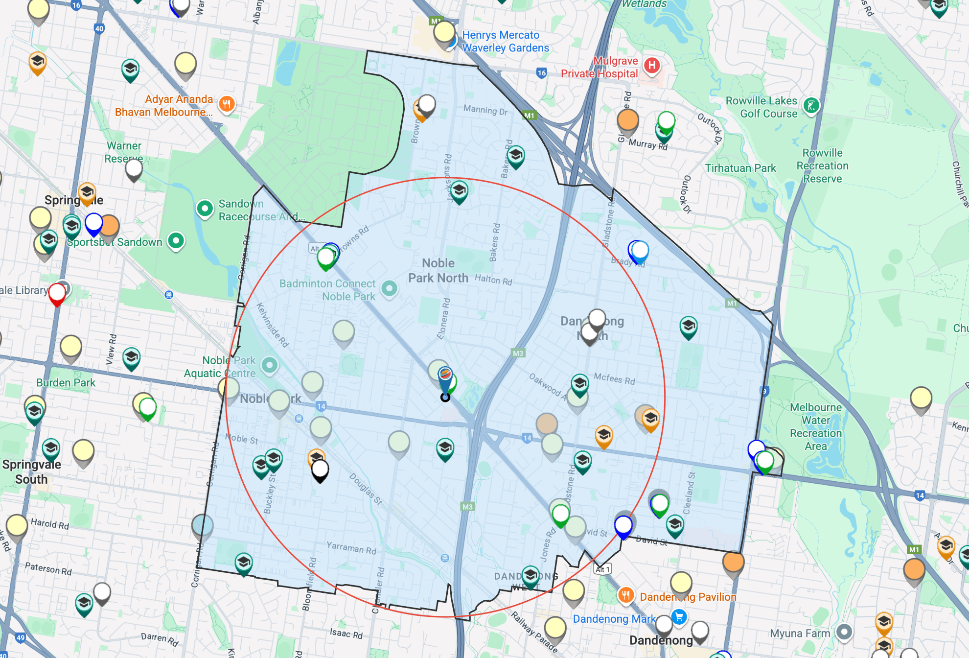 341–343 Princes Highway, Noble Park VIC 3174 | Main Service Area | 2km radius shown outlined in red for context