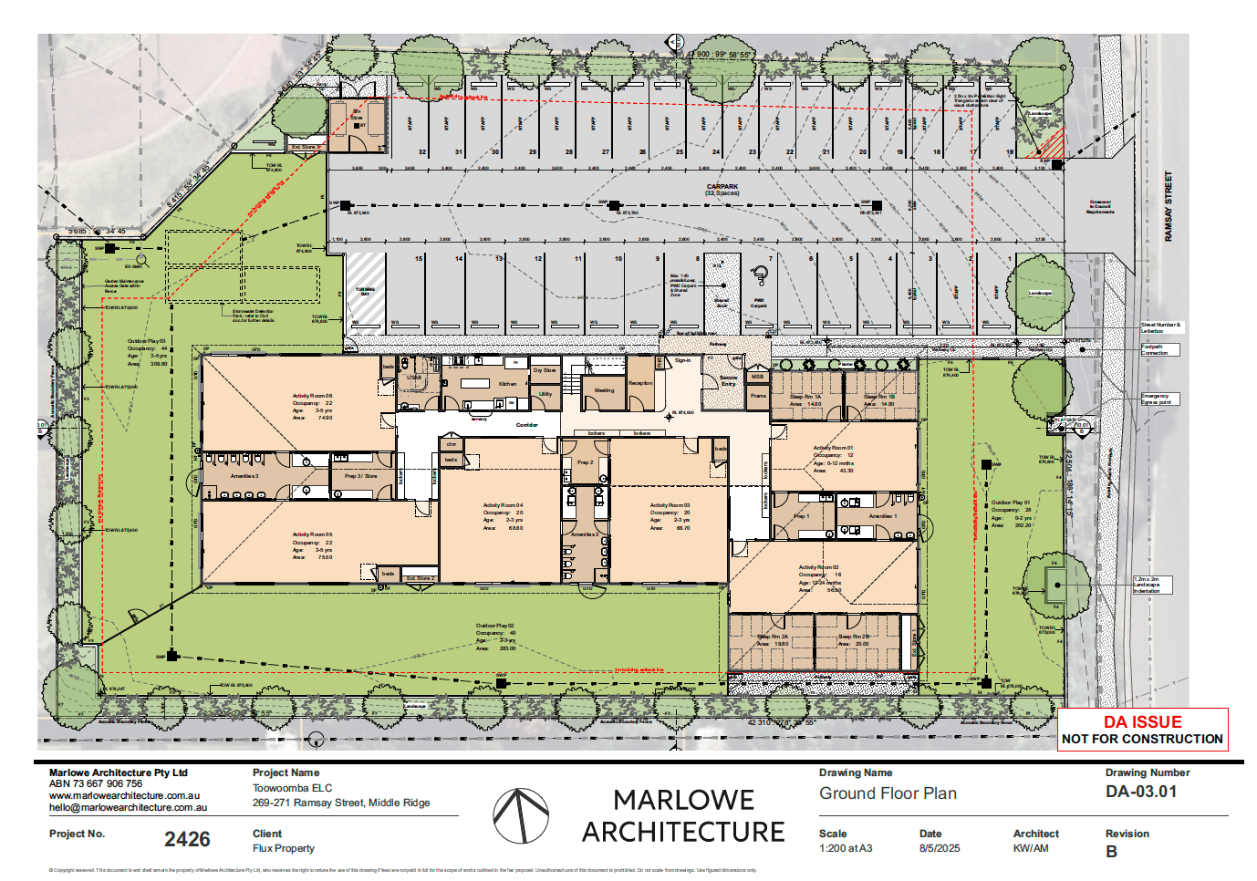 Features: 850 m² building (partial 2nd storey), 800 m² outdoor play, 32 bays (19 staff + 12 visitor + 1 PWD)