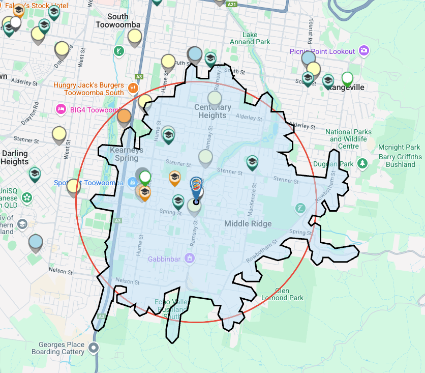 269-273 Ramsay Street (Middle Ridge), Toowoomba Q | Main Service Area ~ 4 min Drive Time, Wed mornings @ 8am | 2km radius shown for context