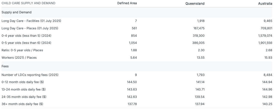 The entire 3 km Canungra catchment is served by just one Long Day Care centre: 📍 Milestones Early Learning Canungra – 50 approved places, Meeting NQS across all areas. 💸 Fees: ~$154/day for under-3s, $149/day for 3–5s.