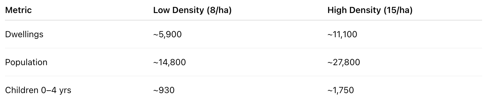 Using standard planning benchmarks (1 LDC per ~10,000 residents), the new community would likely support 2–3 new centres, in addition to the existing 50-place Milestones service.