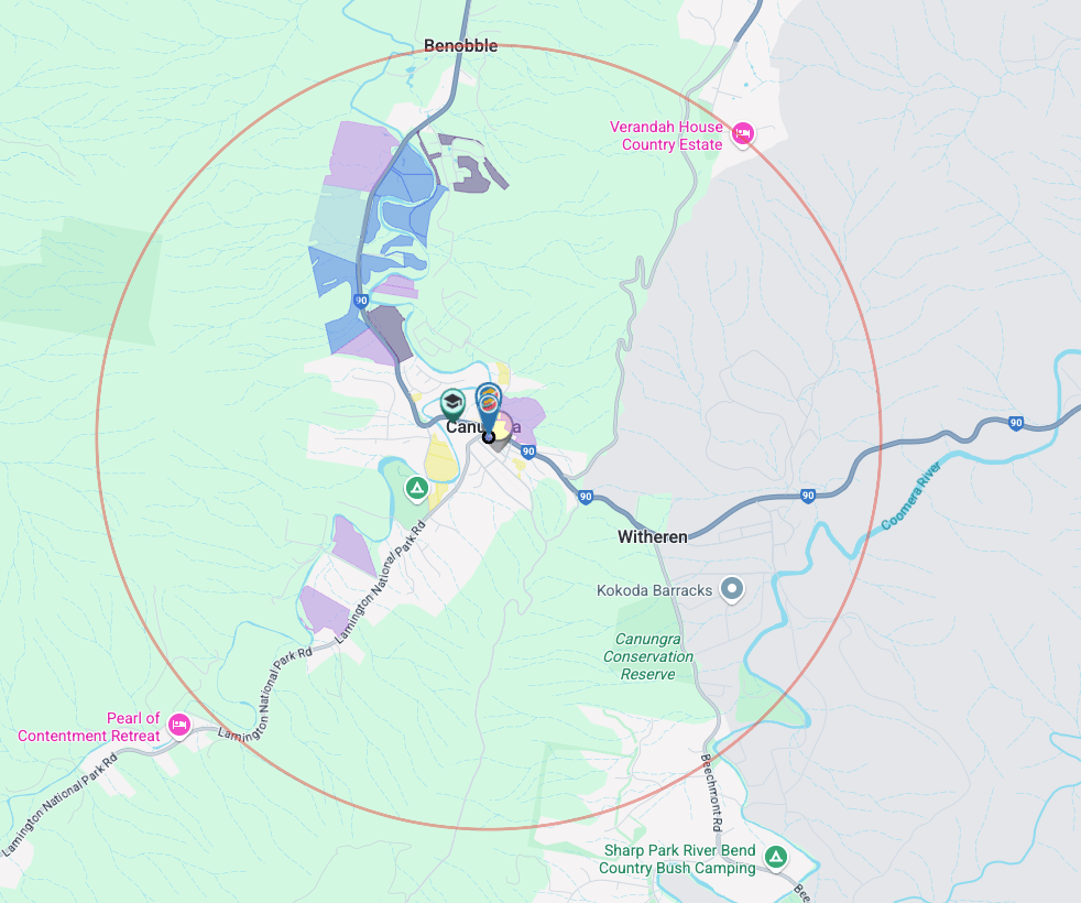 Canungra, SEQ - 3 km radius outlined in red