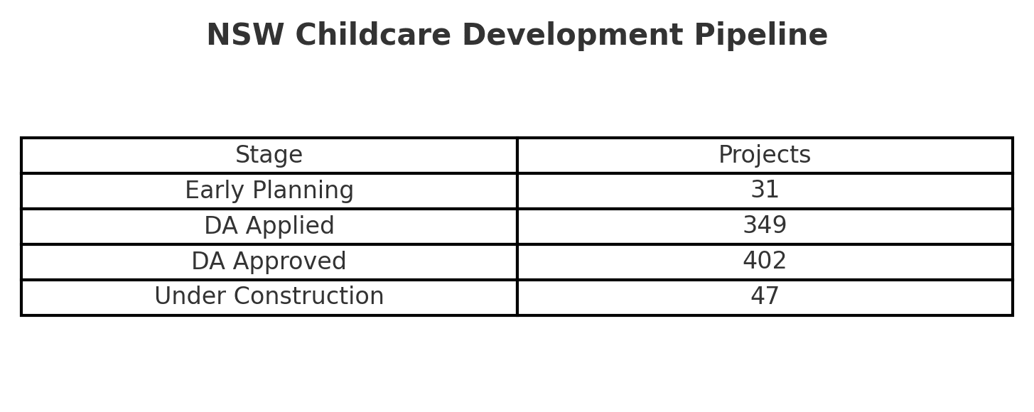 Let’s dive in. 👇 🛠 NSW Childcare Centre Development: Big Stalled Pipeline⚠️ 716 projects in the NSW pipeline, but many are stalled due to rising costs, labour shortages, financing challenges, poor site selection, and operator disinterest. 📊 NSW Childcare Development Pipeline ⚠️ Western Sydney leads in development, with Blacktown and Canterbury-Bankstown emerging as hotspots. However, many projects remain stuck in the planning or approval stages. Big pig in the python. 👶 Demand vs. Demographics